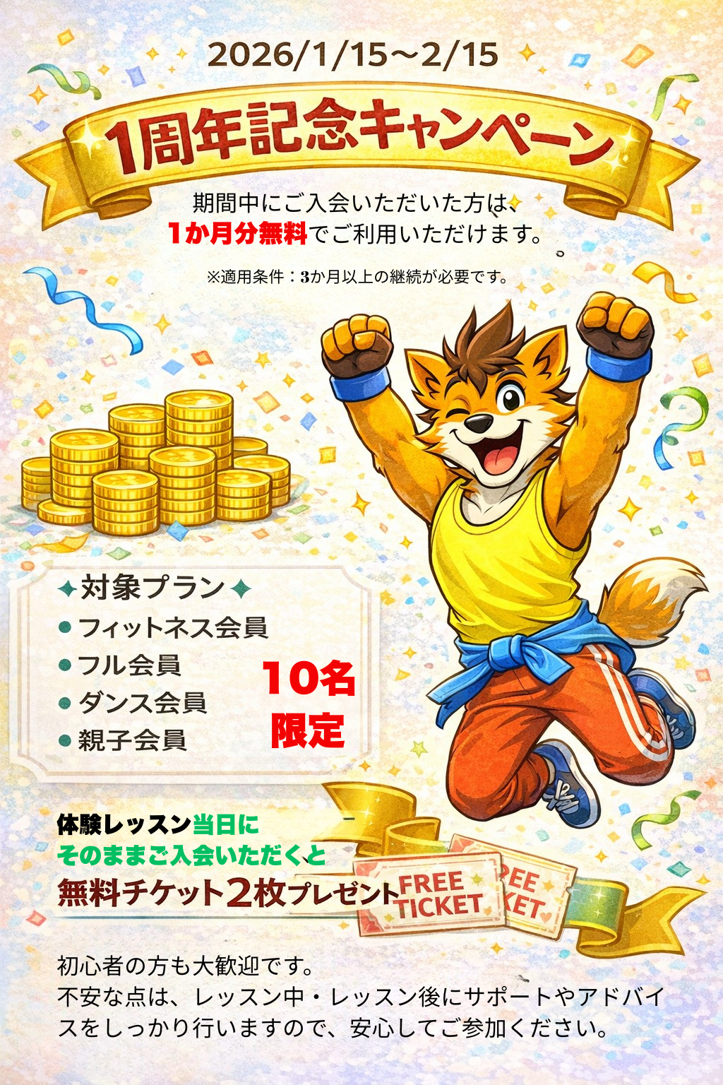 体験レッスン当日にそのままご入会いただくと、無料チケット2枚をプレゼント!